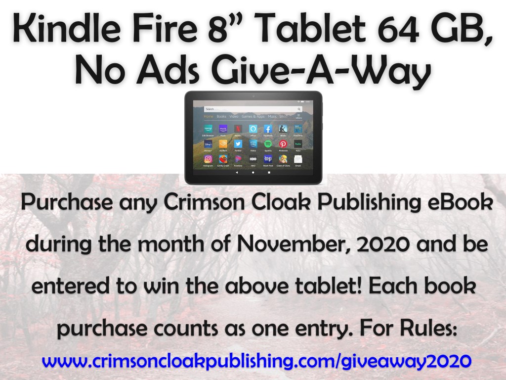 During the month of November, 2020, any purchase of any Crimson Cloak eBook that you screenshot or take a picture of (the purchase page) and send to carly@crimsoncloakpublishing.com will be entered as an entry into our Drawing for a brand new Kindle Fire 8” Tablet! So if you purchase 1 book, you’ll have 1 entry. 2 books, 2 entries, 5 books, 5 entries, and so on.